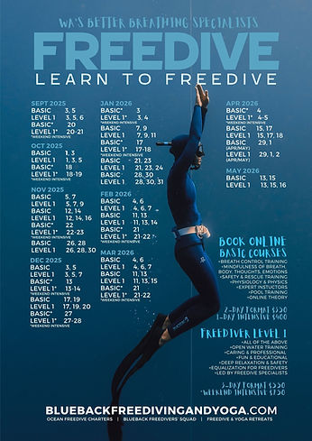 Private Freedive Course by Appointment: Freediver Level 1 One-on-One, $1,390 pp, + $500 per extra pp / Peak Season +$550 per extra pp, 20 hours program: 3 hrs e-learning / 17 hrs private tuition, - not including gear or pool entry fees.